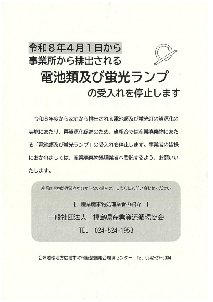 電池類および蛍光ランプの受入れ停止について 2026年3月6日 行政処理施設(環境センター)より受入れ停止の通知がありましたのでお知らせいたします。 このことにより、当組合においても「電池類および蛍光ランプ」の収集運搬処理は不可となりますのでご注意ください。